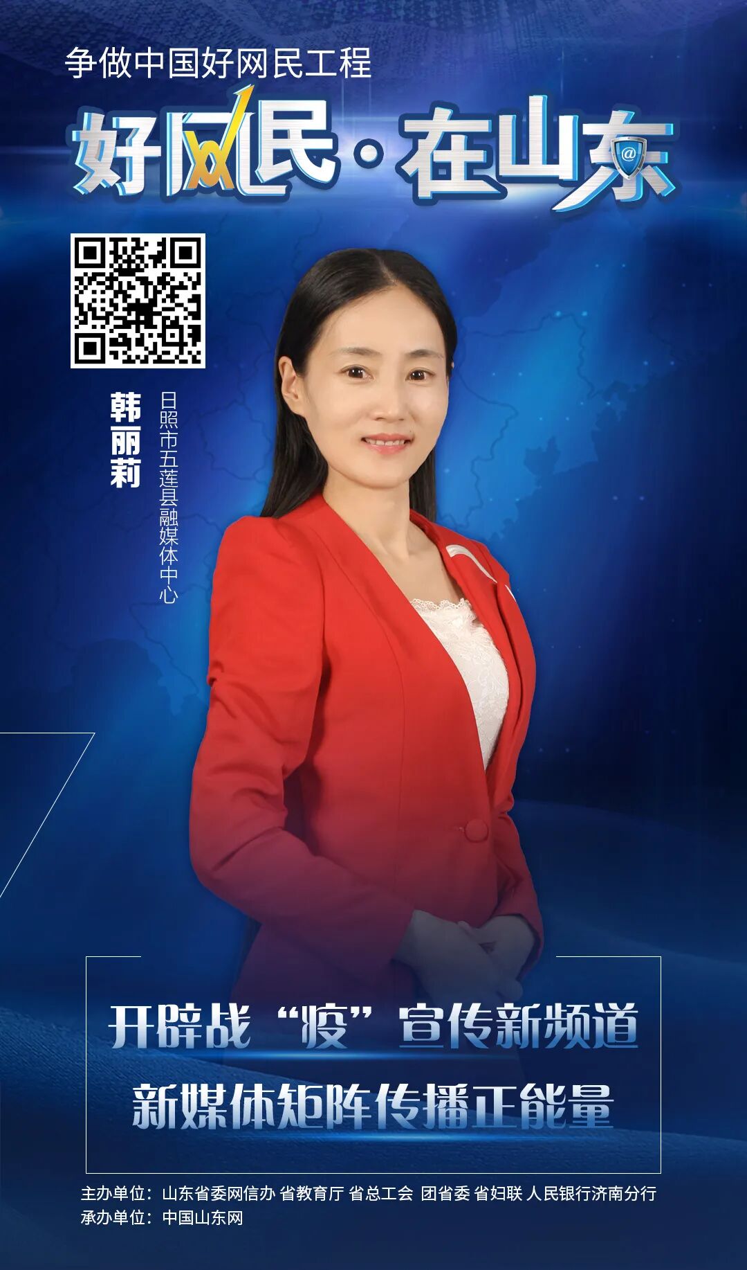 韩丽莉自从事新媒体工作以来,做大做强新媒体宣传,参与开发“掌上五莲”APP客户端,相继申请入驻央视新闻+、新华社、人民日报、闪电新闻、今日头条、抖音、快手、微视等平台,实现媒体产品在央媒以及各个新媒体平台的自主发布。其中,她上传央视客户端的首篇视频作品《三分钟看五莲》,不到一天时间浏览量近200万。