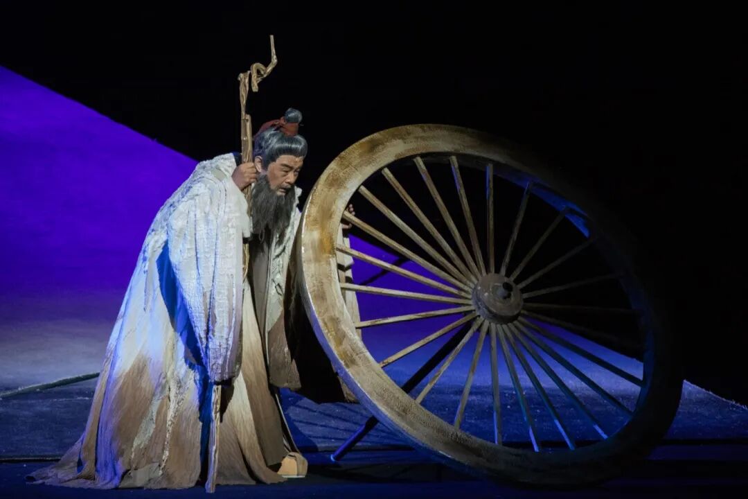 话剧《孔子》中有写实也有写意,但显然写实也是为了写意,现实最终导向超现实。剧中处处可见象征,如舞台多次出现的轮子,有时是孔子周游列国的车,有时是阳货的战车,有时又作表现时间流逝的年轮,有时还能幻化成船,极富意味。情节是幻化的,如《渡河》一幕中写白发苍苍的孔子与一众弟子欲渡过黄河,情节展开却是孔子与阳货的隔岸喊话,孔子与老子的对话,与自己的对话,孔子听闻弟子、家人去世后的恍惚与无助……这一切都是在想象,是孔子屡屡经受沉重打击、崇高理想一次次破灭后孤独、痛苦的内心幻象。当观众理解了剧中象征手法和超现实的情节设置,必定会被仁爱、执着却又至为孤独的圣人孔子所打动!这种艺术震撼是可以久久回味的。