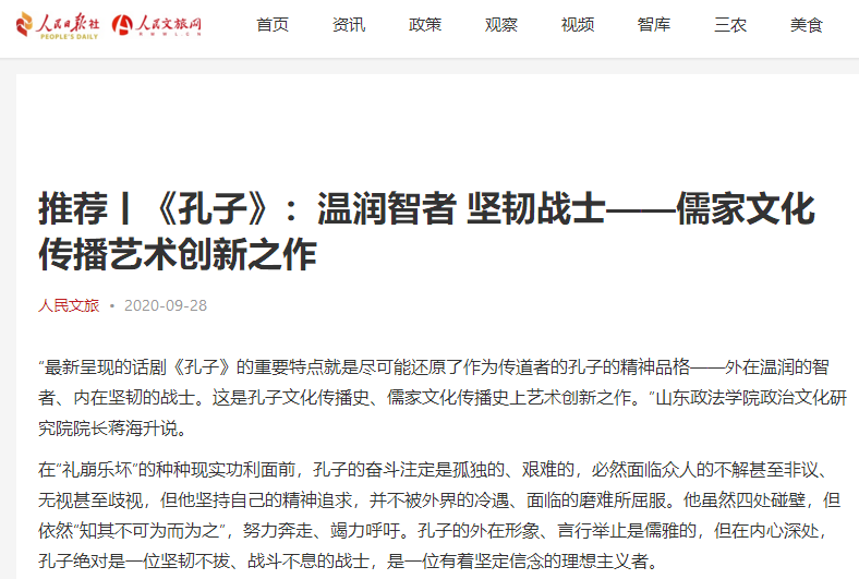 话剧《孔子》是话剧走到今天的跨越式革命,它的突破,一方面是从思想塑造上的突破,也就是孔子作为我们大家都熟知的思想家如何塑造?如何用话剧表现?这是个大难题,该剧在很难找到矛盾的前提下,找到了戏剧冲突,在很难找到心理要素的前提下,实现了把所有观众吸引住;另一方面是在话剧形式上的突破,传统话剧是以说为主,但是张继钢导演的话剧把歌、舞、诗,现代化的灯光,以及包括台词的艺术表现形式都让人耳目一新。这部话剧将会成为时代的标杆,成为经典,打动观众的同时,能够让不同年龄段的观众都能接受。