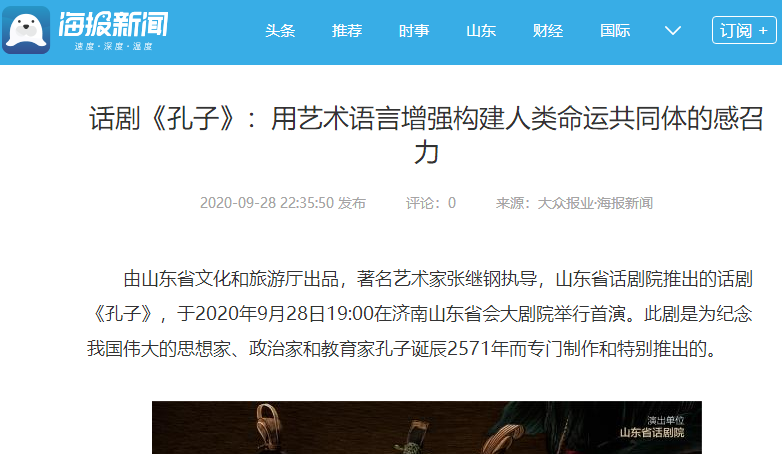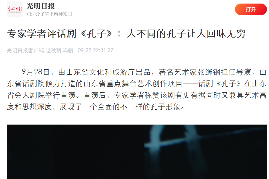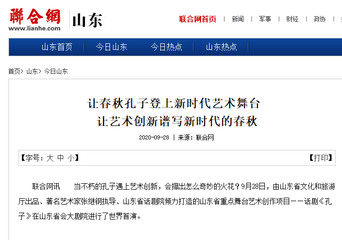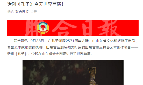 9月28日晚,由山东省文化和旅游厅出品,著名艺术家张继钢担任导演,山东省话剧院倾力打造的山东省重点舞台艺术创作项目——话剧《孔子》,在山东省会大剧院成功首演。
