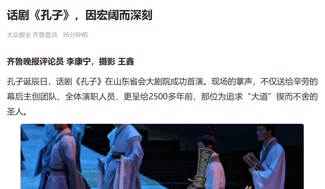 话剧《孔子》选取的矛盾冲突,全面地展现了孔子安贫乐道、直道而行、奋斗不息的精神品格,鲜活地表现了孔子追求理想、矢志不渝的执著精神。具有思想性的作品也需要高超的艺术手段来呈现,实现最能抵达受众心灵深处的最佳传播效果。话剧由著名艺术家担纲主创,以精益求精的艺术追求表现每一个场景,综合运用戏剧、戏曲、音乐、诗歌、舞蹈、绘画、雕塑等多种艺术元素,在有限的舞台上诗意地表现出特有的春秋情景,艺术团队激情迸发,表演精湛,堪称一部洋溢着浪漫主义精神、格调高古、力量遒劲、美轮美奂的史诗性“诗剧”,是孔子文化传播史、儒家文化传播史上可贵的艺术创新之作。