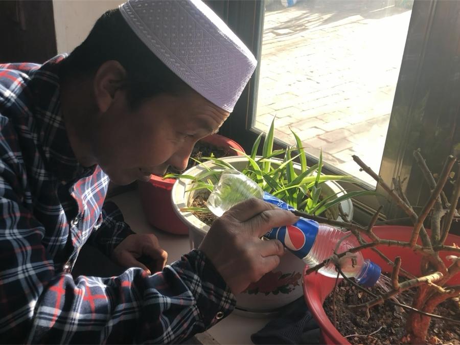 宁夏平罗县脱贫户马康福正在给家中绿植浇水。新华社记者张亮 摄