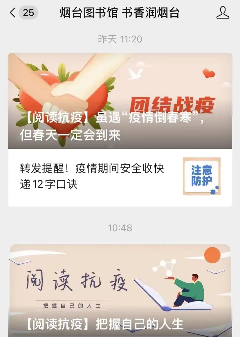 内容:疫情防控期间,烟台图书馆积极发挥职能优势,充分利用本馆数字资源和新媒体平台优势,积极通过线上方式开展阅读推广和相关知识服务,让读者们在疫情期间体验“宅”阅读的乐趣,感受书香烟台的独特魅力,为读者创造安心的居家环境。闭馆期间,通过微信公众号每天推出【阅读抗疫】系列线上图书推荐活动,满足读者的知识和文化需求,以特有的方式支持新一轮抗击新冠疫情工作。