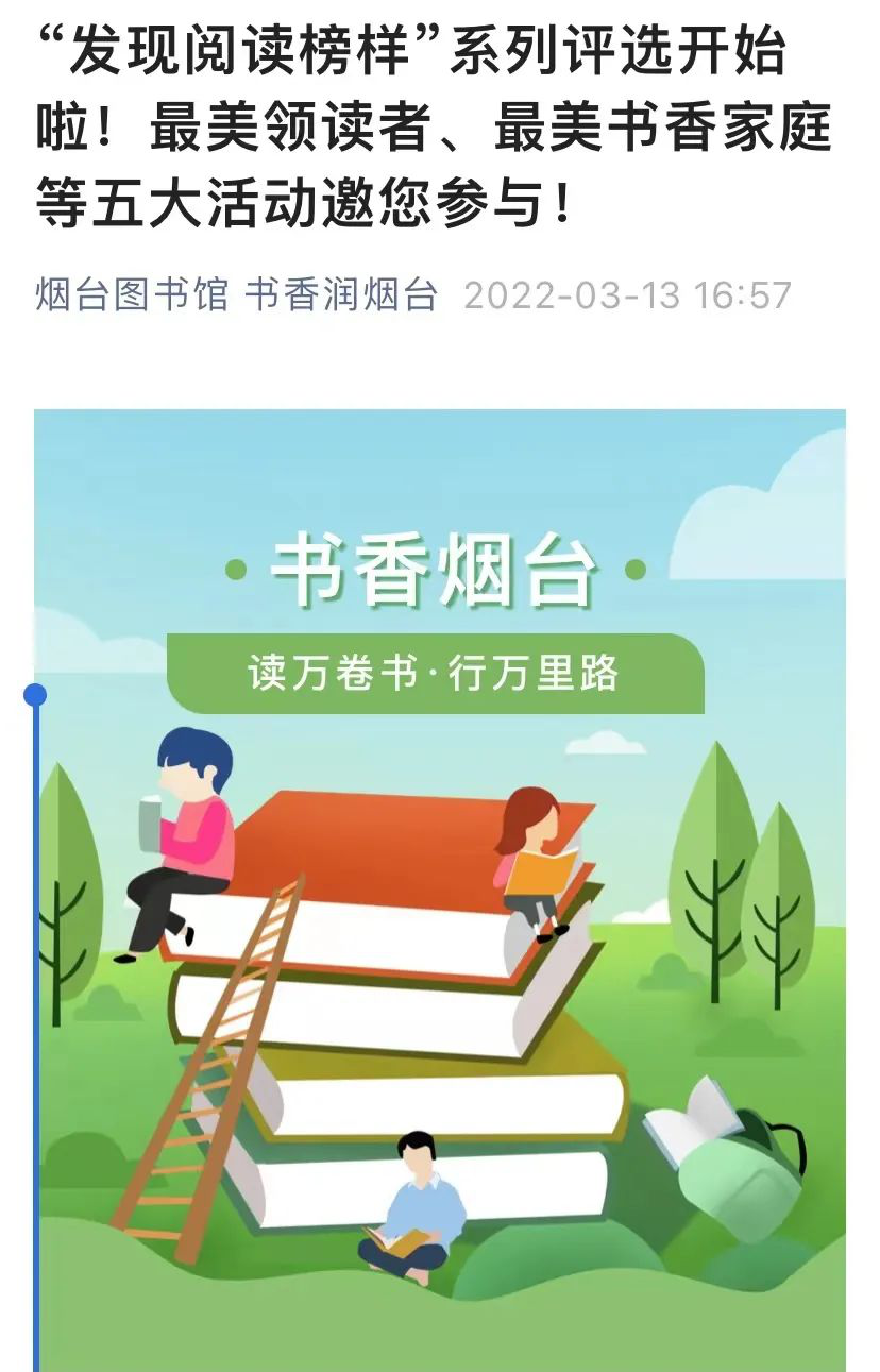 内容:为深入贯彻《烟台市全民阅读促进条例》,扎实推进“书香烟台”和全国文明城市创建工作,充分发挥全民阅读先进典型的示范带动作用,促进形成良好的阅读风尚,拟在全市开展“发现阅读榜样”烟台市最美领读者、全民阅读示范基地、最美城市书房(阅读空间)、最美书香家庭、最佳全民阅读推广品牌评选活动。