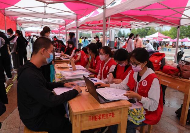 迎新现场,学生团体与志愿者齐动员,细致周到热情服务,充分展示了滨医人的盛情。选优配强400余名志愿者团队,统一着装、配合默契,引导、介绍、帮办、送行李等环节丝丝相扣、有条不紊。学校融媒体中心发挥融媒体优势,以抖音、微博等备受新生喜爱的方式全程直播,留影存彩,给2022级新同学留下美好回忆,记录他们人生的重要时刻;线上进行迎新直播,也让家长更全面了解学校情况,满足家长因疫情不能陪同办理报到手续的遗憾,让家长放心;在开学前就开展了“主播带你逛校园”活动,帮助新生们提前了解校园生活。