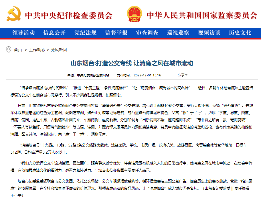 “我们充分发挥公交车流动性强、覆盖面广、距离群众近等优势,将廉洁元素有机融入人们的日常出行中,使清廉之风在城市中流动,在社会中传播,有效增强廉洁文化的辐射力、感召力和渗透力。”烟台市公交集团主要负责人表示。