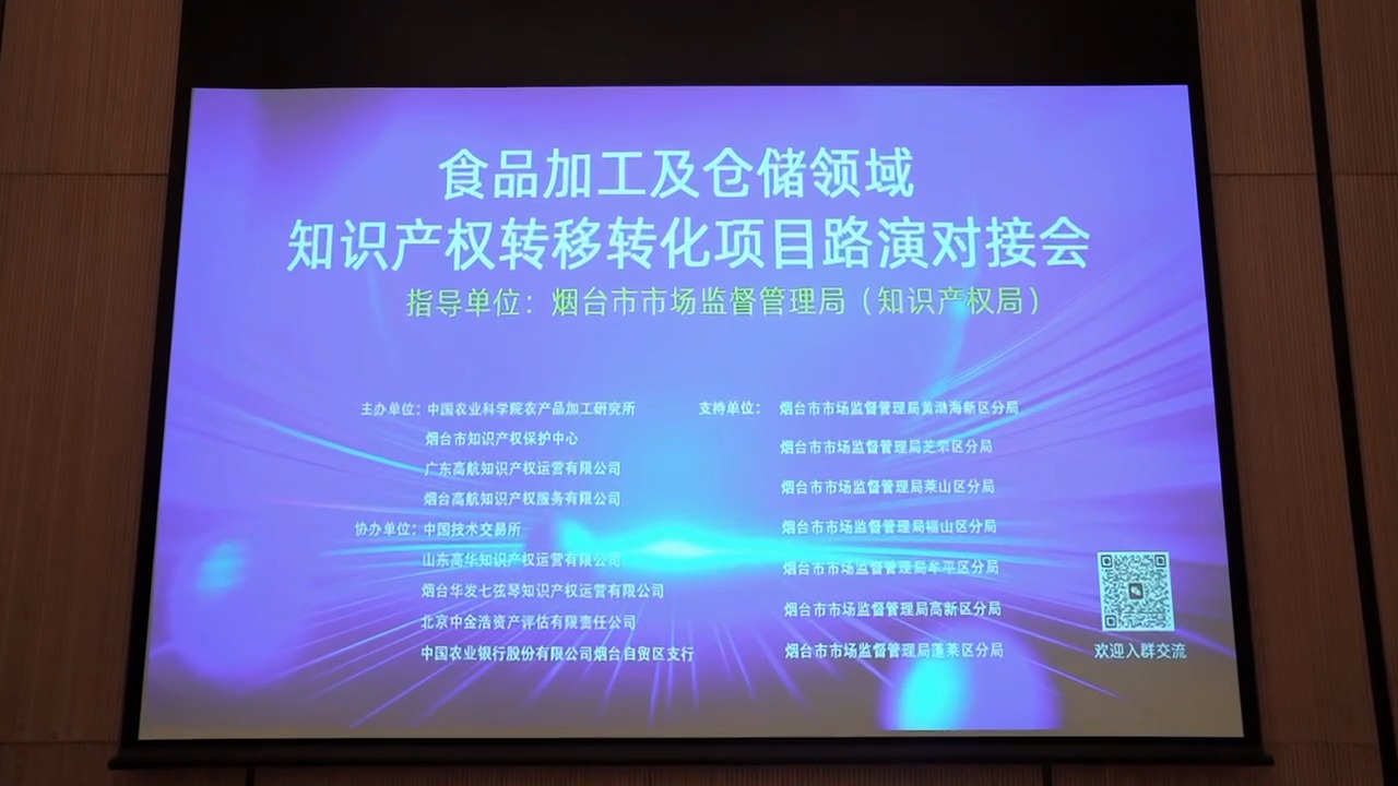 胶东在线3月14日讯 3月14日,烟台市食品加工及仓储领域科技创新及知识产权转移转化项目路演对接会在烟台鑫广万豪酒店圆满召开。本次对接会由烟台市市场监督管理局(知识产权局)指导,由烟台市知识产权保护中心、广东高航知识产权运营有限公司、中国农业科学院农产品加工研究所、烟台高航知识产权服务有限公司联合主办。烟台喜旺食品有限公司、烟台欣和企业食品有限公司等70余名烟台市食品企业代表参会。