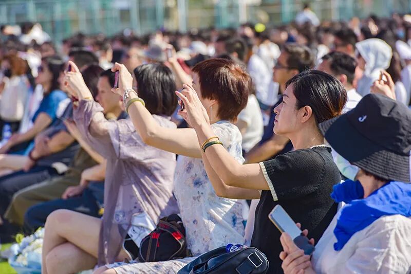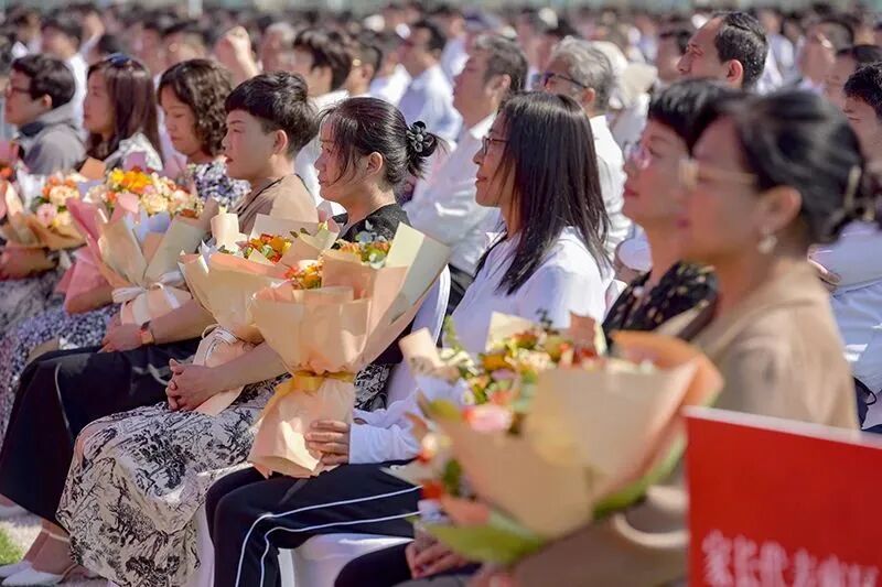 本届典礼特别设置了毕业生向教职员工代表和家长代表献花环节,毕业生献上了一束束饱含着浓浓感恩之情的鲜花。师恩如海,话不尽谆谆教诲;父母恩情,道不尽无私陪伴。在蓝天白云的映衬下,呈现出一幅其乐融融、温馨感人的画面。