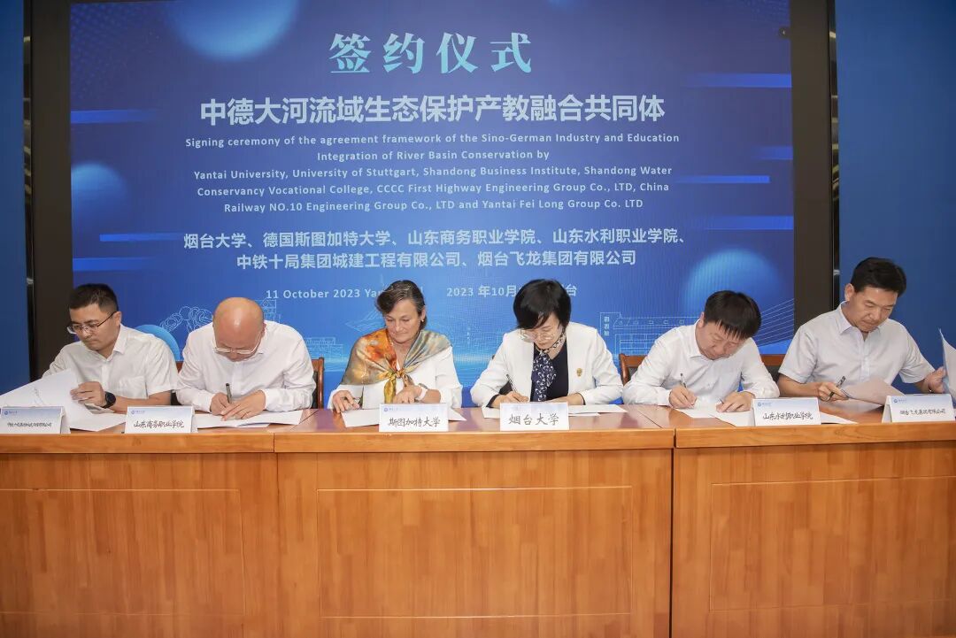 烟台大学副校长冯素玲、德国斯图加特大学副校长Silke Wieprecht、山东商务职业学院副校长陶传蔚、山东水利职业学院办公室主任柴换成、中铁十局集团城建工程有限公司副总经理王宪刚、烟台飞龙集团有限公司总经理宋健共同签约,联合成立中德大河流域生态保护产教融合共同体。