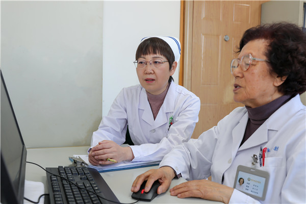 于鲁欣(左)与赵九芝(右)审核护理病历