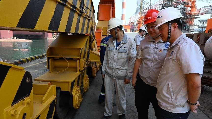 随后,在相关技术人员的陪同下,烟台市特检院一行实地参观了中集来福士的生产现场和设备设施,对特种设备的实际运行情况有了更加直观的了解。