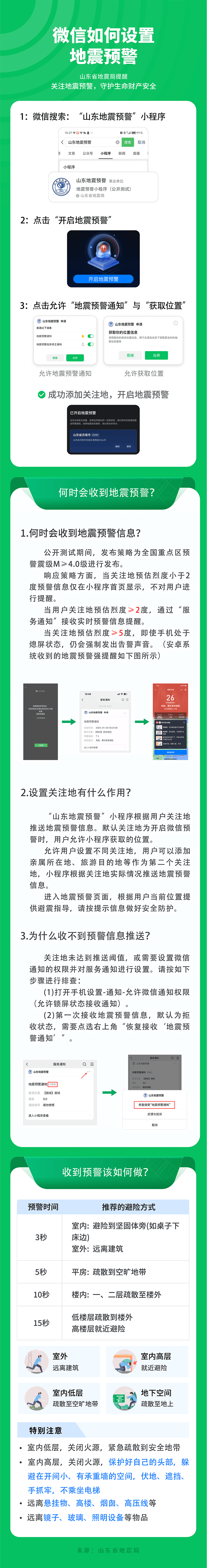 在微信搜索“山东地震预警”小程序,点击“开启地震预警”,并允许“地震预警通知”与“获取位置”,成功添加关注地即可开启地震预警服务。具体设置步骤如下↓↓↓