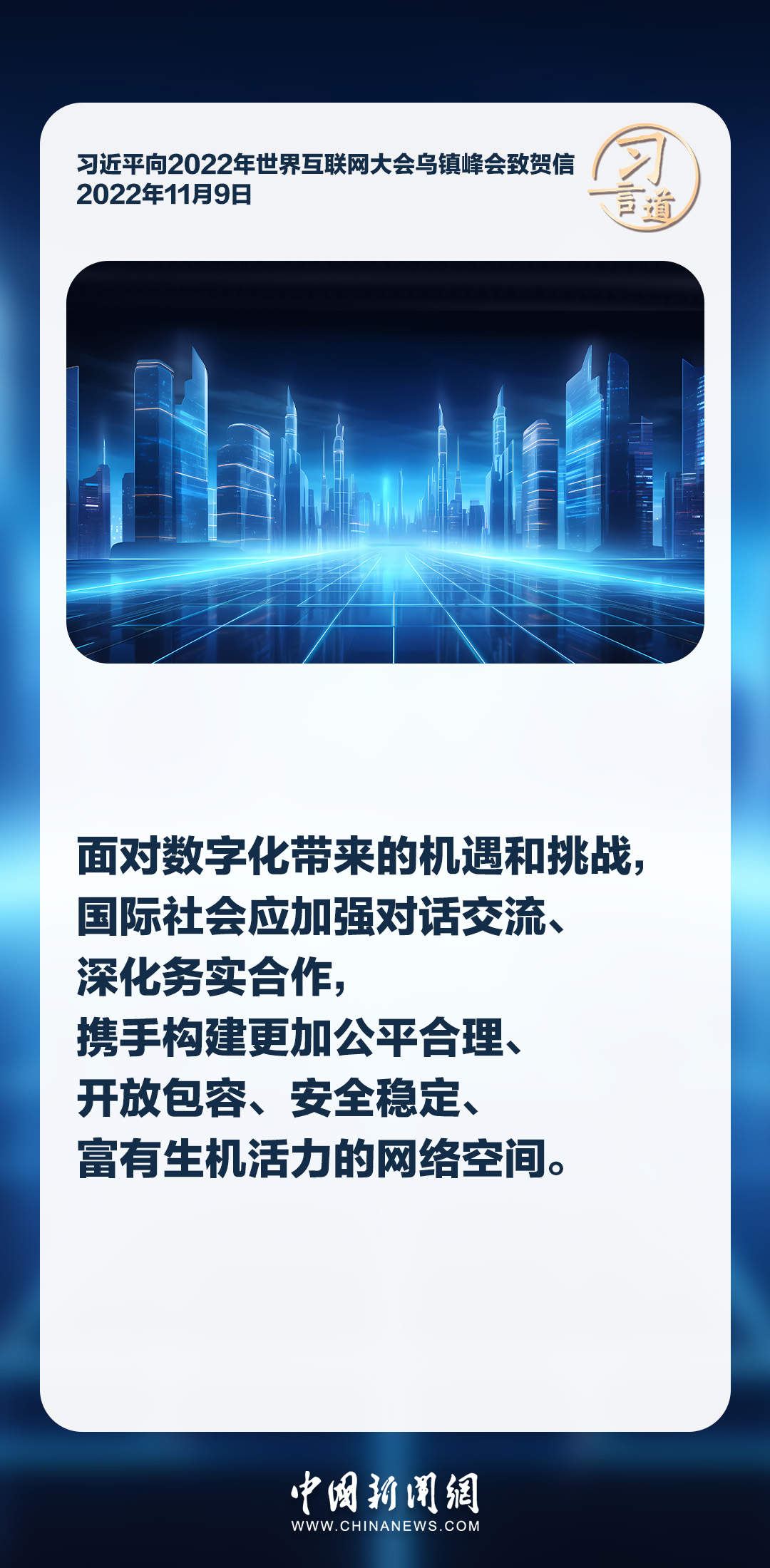 信息革命时代潮流浩荡前行,网络空间承载着人类对美好未来的无限憧憬。习近平主席多次强调各国应该共同构建网络空间命运共同体,推动网络空间互联互通、共享共治,为开创人类发展更加美好的未来助力。