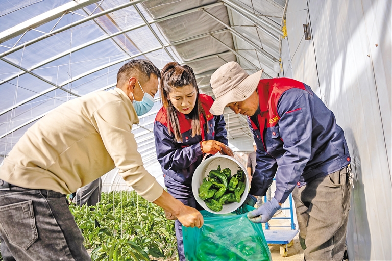 工作人员在将采摘的辣椒装袋。本网记者 阿旺尼玛 摄