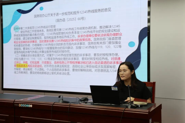 会上,区热线办工作人员领学了上级关于12345政务服务便民热线工作的最新政策文件,特别是《国务院办公厅关于进一步规范和提升12345热线服务的意见》,逐一解读条款内容,严格把握工作原则,确保规范落实到位。