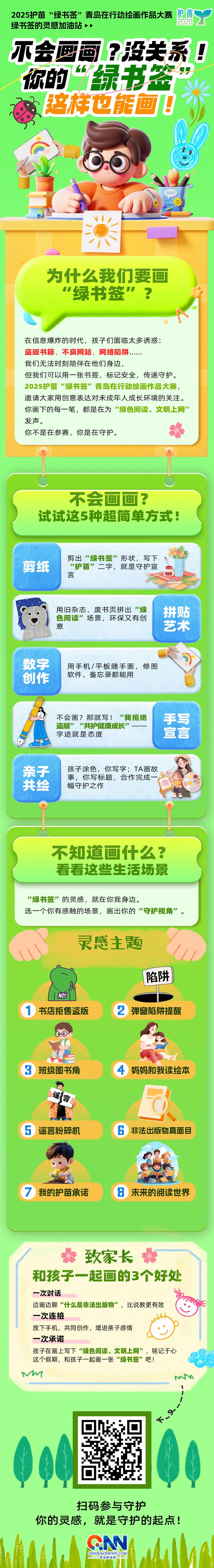 青岛新闻网9月30日讯 2025护苗“绿书签”青岛在行动绘画作品大赛已正式启动!为帮助参赛者打开思路、激发创意,主办方特别推出创意指引长图——《绿书签的灵感加油站》。从“一本书”到“一座灯塔”,从绿色阅读到文明上网,一张图解锁多种创作方向,让每一份守护都有迹可循。快来看图获取灵感,用画笔为孩子们的成长点亮一盏灯!
