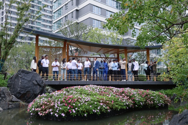 上午9时,活动在高新区万科天琴湾正式启动,小区内的中式园林景观随即吸引了海外嘉宾们的目光。假山流水相映成趣,绿植花卉点缀其间,尽显东方园林的雅致韵味。嘉宾们在参观过程中不时驻足拍照,感叹于中式园林的诗意与和谐之美。