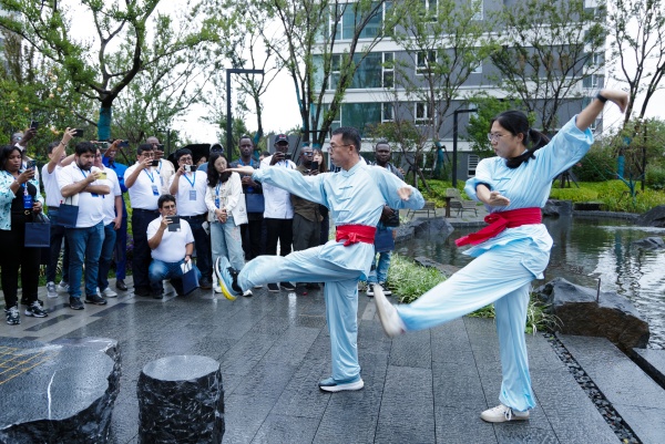 最后,嘉宾们体验了中国传统武术——螳螂拳。由国家级非物质文化遗产螳螂拳代表性传承人于永波先为大家展示了一套螳螂拳套路,动作刚劲有力、灵活多变,赢得了嘉宾们的阵阵欢呼与掌声。嘉宾们热情高涨,纷纷走上前学习体验。于老师向嘉宾们讲解了螳螂拳的基本招式和实战应用技巧,让大家对螳螂拳有了更加深入的了解,感受到了中国传统武术兼具观赏美感与实战应用的独特魅力。中国铝业几内亚有限公司的陆西朗·西拉在采访中感慨道:“这种从大自然里找灵感的武术特别新鲜,忽然明白中国文化里很喜欢从万物中学习智慧,我想回家跟家人分享中国有这么特别的武术。
