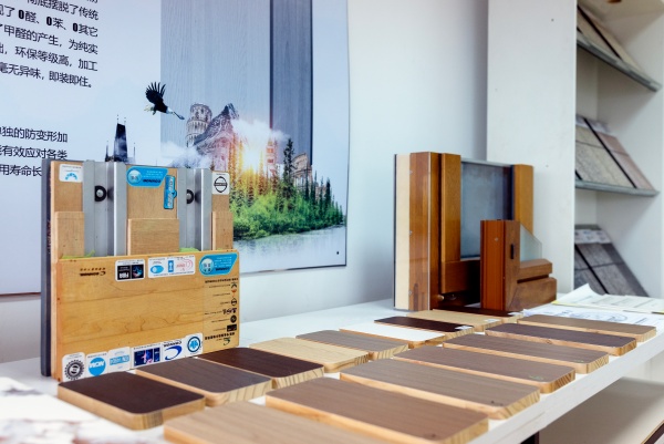基于该无醛胶粘剂技术,公司开发出多个系列绿色建材产品,总工程师谢明义逐一向大家展示介绍了公司自主研发的核心产品。“植物基功能性腻子:具备调温控温与湿度调节功能,提升居住舒适度;植物基生态内墙涂料:可分解甲醛等污染物,净化室内空气,即涂即住;无醛实木板材与结构用集成材:具备防潮、防腐、阻燃等性能,适用于家居与工程场景。”谢明义补充说道,“除了家装用在室内的材料,公司还研发了‘全生态无醛竹钢’用于建筑主体的搭建。其以竹材为原料,通过冷压工艺制成高性能复合材料,实现‘以竹代木,以竹代钢,以竹代塑’,拓展了竹材在结构领域的应用范围。”
