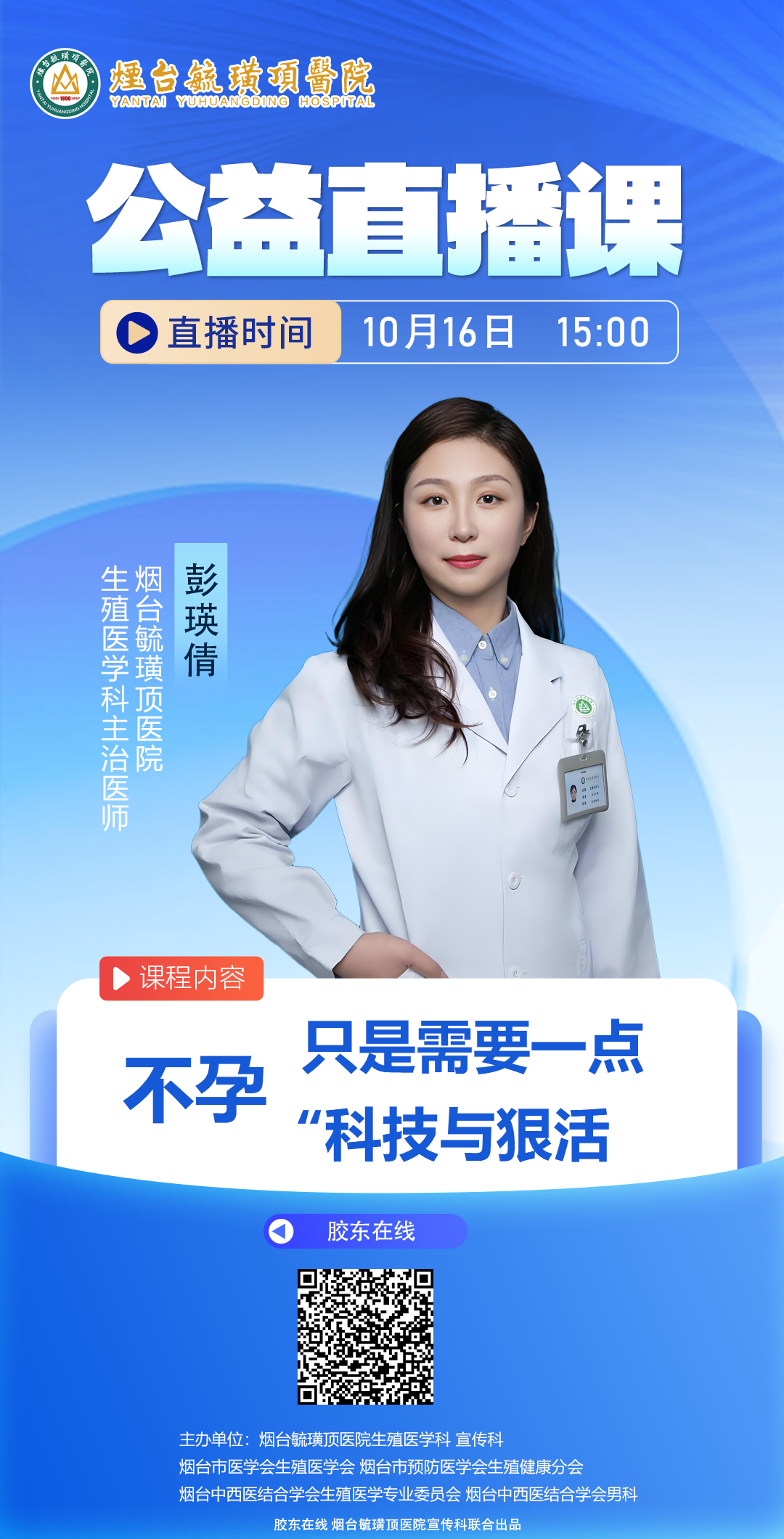 若你正受不孕困扰,10月16日(周四)下午15:00,“不孕— 只是需要一点‘科技与狠活’”直播,烟台毓璜顶医院生殖医学科主治医师彭瑛倩带你深入了解不孕知识,解析应对办法,助你拥抱生育希望!