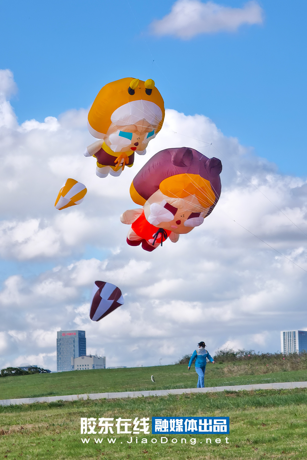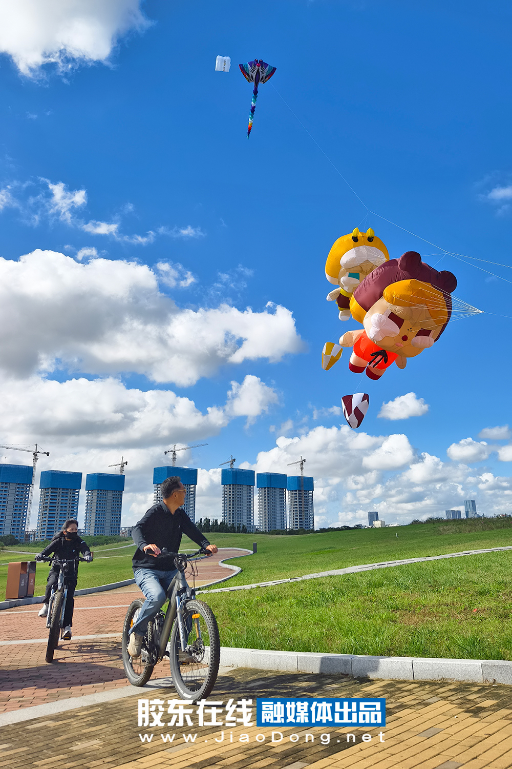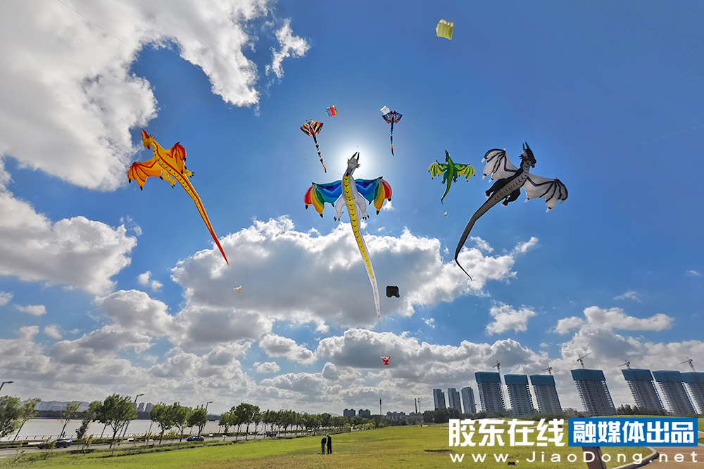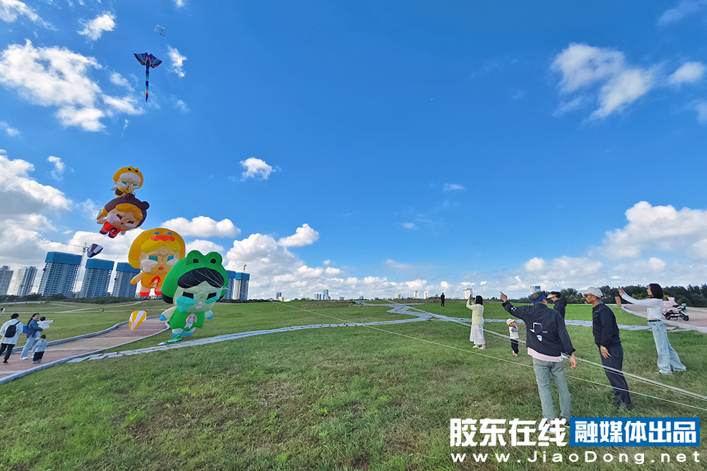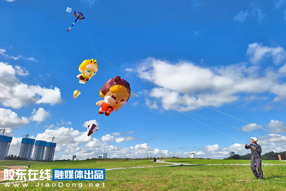 10月14日,结束了连日的阴雨,烟台迎来碧空万里。风筝爱好者们来到开发区外夹河畔进行放飞。数只可爱的卡通造型风筝随风轻舞,宛若置身童话世界。(摄影 李刚)