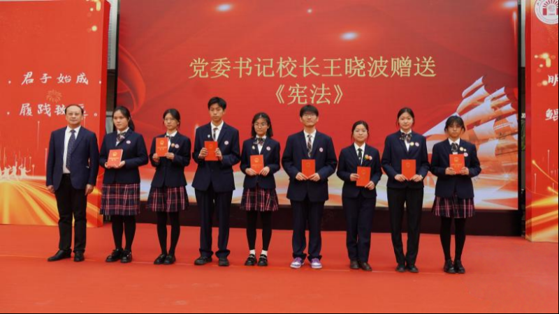 仪式上,王晓波校长发表了深情寄语。他以“致十八岁的追光者:以青春为笔,绘天地众生”为题,勉励同学们在自省中“见自己”,扛起对自我的责任;在拼搏中“见天地”,扛起对梦想的担当;在同行中“见众生”,扛起对他人与社会的责任。校领导向各班学生代表赠送了《中华人民共和国宪法》读本,希望同学们明确公民责任,筑牢法治信仰。