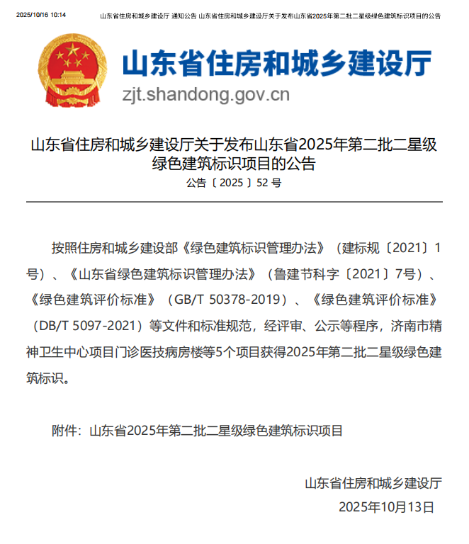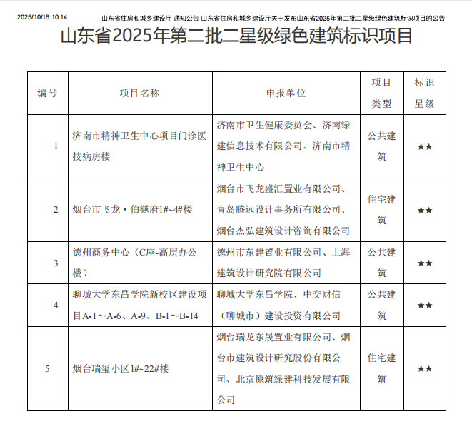 胶东在线10月23日讯(通讯员 林昕霆)近日,山东省住房和城乡建设厅公示了《2025年第二批二星级绿色建筑标识项目》。全省共5个项目成功获评,其中烟台市占2席,黄渤海新区瑞玺小区即为其中之一。