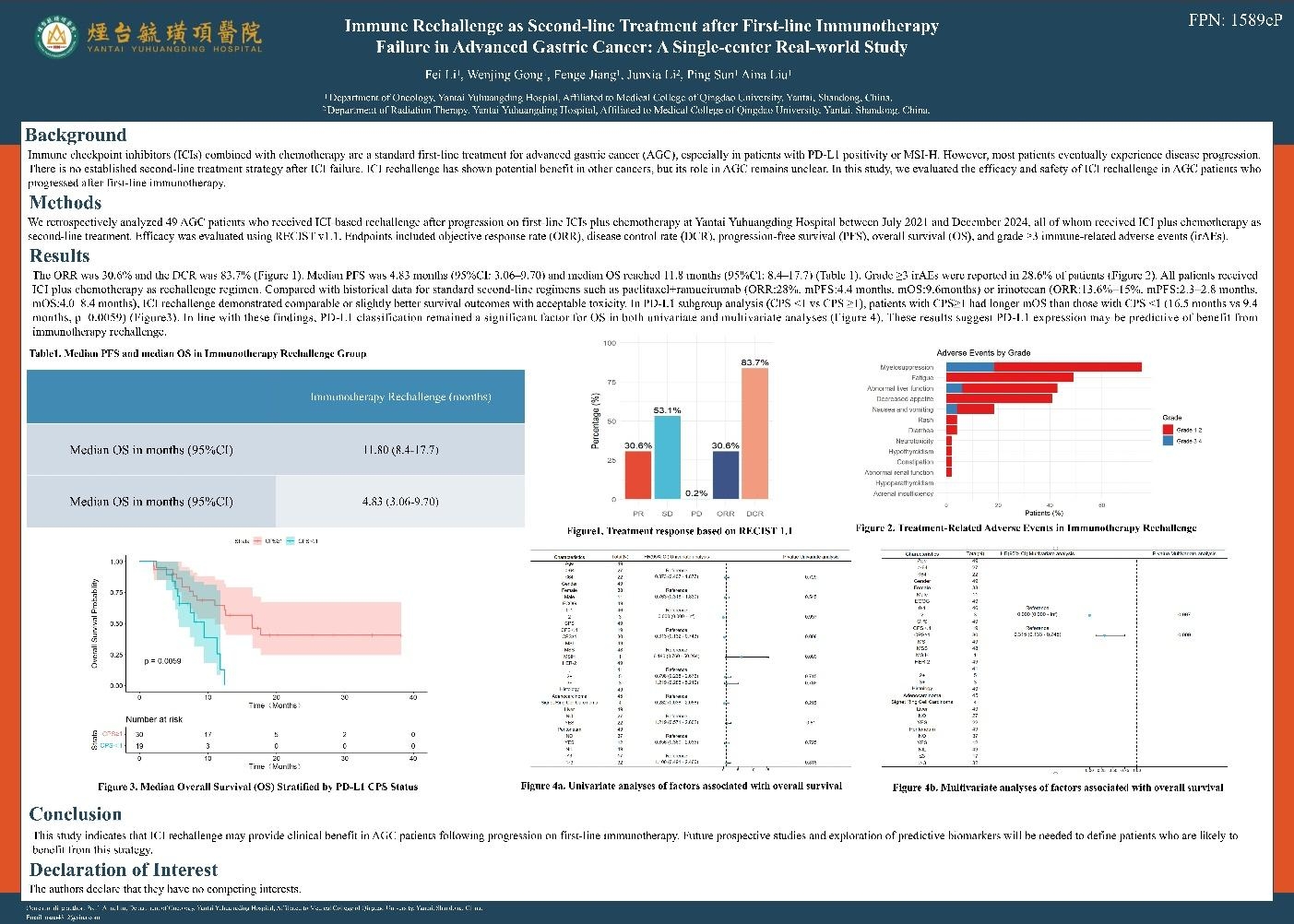 会上,由毓璜顶医院肿瘤内二科主任刘爱娜和宫文静指导的青岛大学医学院研二研究生李菲,研究成果成功入选大会电子海报,向国际同行展示了医院在晚期胃癌免疫再挑战治疗领域的重要探索与突破性进展。该成果以《Immune Rechallenge as Second-line Treatment after First-line Immunotherapy Failure in Advanced Gastric Cancer:A Single-center Real-world Study》为题,核心聚焦一线免疫联合化疗进展后患者的二线治疗策略优化,系统回顾分析了49例接受免疫再挑战治疗的晚期胃癌患者临床数据,重点评估了客观缓解率(ORR)、疾病控制率(DCR)、无进展生存期(PFS)、总生存期(OS)及≥3级免疫相关不良事件(irAEs)等关键指标,并深入探讨PD-L1表达对治疗疗效的预测价值。研究结果显示,免疫再挑战治疗在生存获益方面表现出可比或略优的临床疗效,且治疗毒性可控,PD-L1表达有望成为预测疗效的重要生物标志物。这一成果为晚期胃癌二线治疗提供了极具价值的临床参考,也为进一步优化免疫再挑战治疗策略奠定了坚实基础。