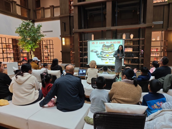 活动在“捉泥鳅”的轻松互动中温暖启幕,迅速拉近参与者之间的距离。随后,阅读推广人、高级家庭教育指导师隋利娟老师以“猫有九条命”的民间传说为引,逐步带领大小读者走进那只活了百万次的虎斑猫的哲学世界。她从孩子们对生活中猫咪的认知出发,巧妙抛出“如果你能活一百万次,哪一次是你真正想要的人生”这一灵魂之问,引发全场对生命价值的静默沉思。