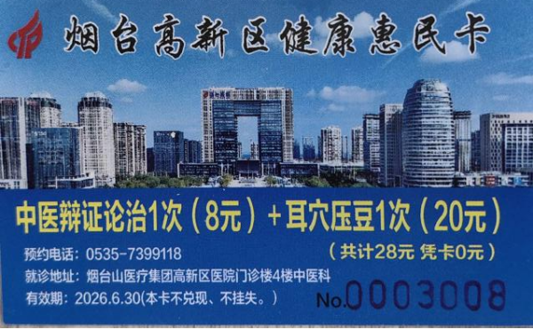 活动期间,持“烟台高新区惠民健康卡”可免费享受辩证论治与耳穴压豆;