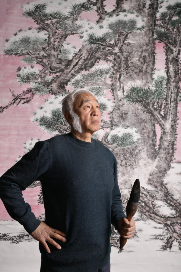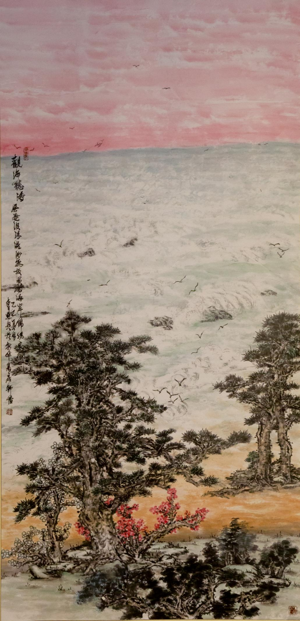 (曹连兴先生祖籍山东日照,一九五零年出生于烟台,著名画家、艺术家、收藏家。现任韩中书画家协会驻中国主席、香港书画家协会主席,英国牛津艺术学院、加拿大维多利亚皇家艺术学院、中央美术学院客座教授,中国非物质文化遗产新时代非遗文化传播大使、神州书画院院长等职务。其艺术领域涉猎广博,根雕、盆景、园艺、书法、篆刻、绘画、鉴赏、装裱等无一不精。绘画作品汲取众家之长,粗狂豪放不失细腻,“集精华、求自然、得精神”,秉承“让作品讲话”准则,擅做巨幅、闻名中外。前国家主席华国锋为其题赠斋号“明清斋”,历年来多次得到张爱萍上将、苏毅然、李予昂、高启云、俞正声等时任领导人合照题识。得到吴作人、费新我、启功、林散之、刘开渠、李可染、沙孟海、黑伯龙、舒同、许麟庐、于希宁、王伯敏、孙其峰、慕凌飞等百余位书画家的肯定及题字合作,十多次举办个人大型展览,出版多部画集,作品备受国内外博物馆及藏家青睐。曹连兴先生擅长中国花鸟、人物、山水画的创作,尤其喜好巨幅中国画创作。其中1998年创作的高11米,长16米的世界最大松柏题材国画《中华魂》,曾获世界吉尼斯纪录。早在八十年代,中央电视台“神州风采”“华夏掠影”等栏目,以及《人民日报》《光明日报》和地方媒体等均对曹连兴先生的艺术成就做过多次专题报道。)