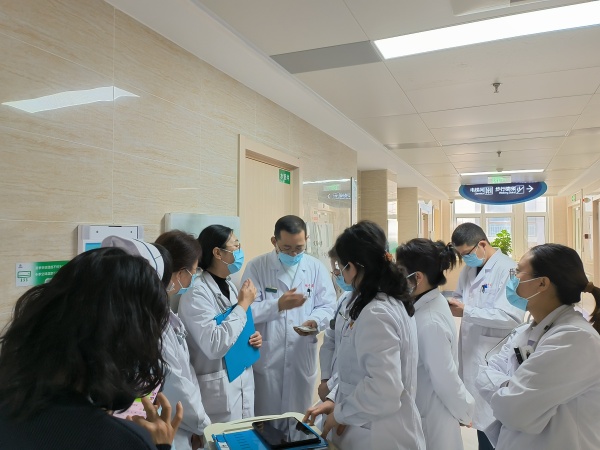 授旗仪式结束后,巡回医疗队立即奔赴烟台经济技术开发区大季家医院开展首次巡回诊疗。这支由14名精兵强将组成的医疗队,涵盖呼吸、血液、消化、普外、疼痛、重症、中医、护理等多个专业领域,队员们按照专业分组,与大季家医院医师进行联合查房,现场指导治疗方案,并针对6例疑难病例组织了多学科会诊。大季家医院医务科陈永钰表示,联合查房和多学科会诊为基层医院带来了“现场教学”,极大地拓宽了临床视野,启发了新的诊疗思路,欢迎巡回医疗队将这种高效的协作模式常态化,共同提升医疗水平。