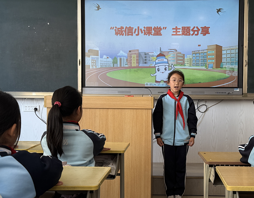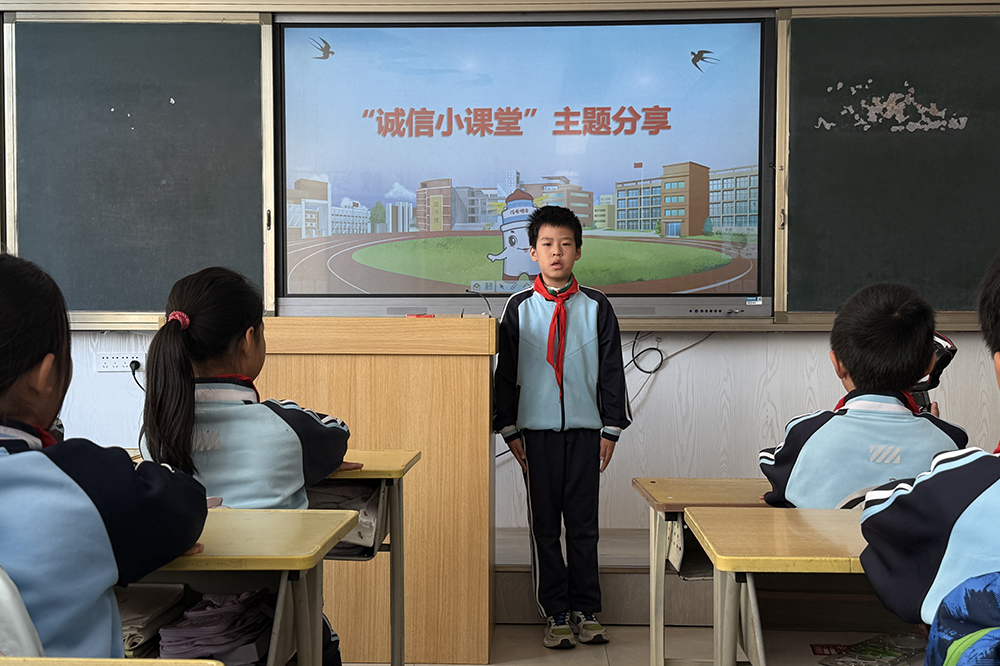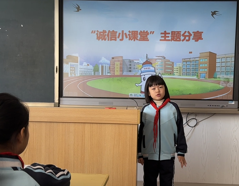 “诚信小课堂”主题分享环节满是童真与担当。学生代表依次上台,讲述自己的“诚信故事”。刘苑博同学分享道:“有一次去超市买东西,老板多找了五块钱,回到家发现后,立马就送了回去,老师、家长教育我们要讲诚信,所以这种便宜不能占!”翟婉如同学则说:“我的妈妈就是我的诚信榜样,她有次去买菜,装袋的时候老板装错了,还多给了好多,妈妈说多给的要还回去,做人要守信,未经别人同意的事情,咱们不能多拿。”“我的妈妈工作非常忙,有次她回家着急整理文件,整理的过程中去办了别的事情,我就玩起了电脑,一不小心把文件删掉了,在妈妈不知情的情况下我主动承认了错误,妈妈跟我说诚实守信比重新做个文件更重要,这句话像明灯一样一直指引着我,我也将永远铭记于心。”杨雨瑶同学通过朴实的话语讲述了一段平凡的经历,让台下的同学们深受触动。