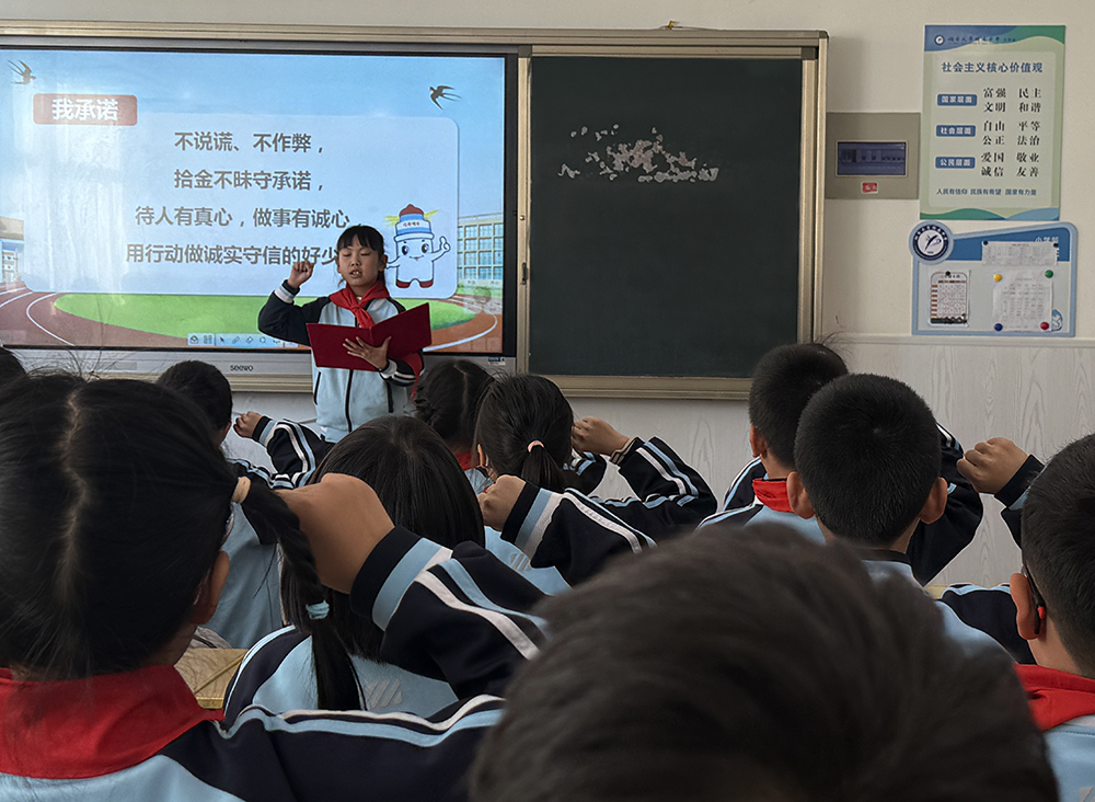 “我承诺:不说谎、不作弊,拾金不昧守承诺,待人有真心,做事有诚心,用行动做诚实守信的好少年!”在“诚信践诺”集体宣誓环节,全体学生起立,跟随学生代表王菁莹举起右拳,一同许下铿锵有力的誓言,庄重的仪式感让诚信意识更加深入人心。