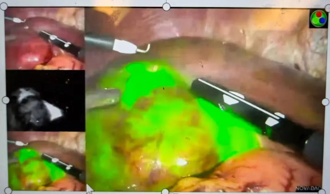 团队首先利用术中超声技术,定位并精准穿刺肿瘤供血门静脉分支,随后将荧光剂注入。随着血流,荧光剂使得肿瘤所在区域呈现出明显的绿色染色效果,从而实现对切除区域的精准定位。“这就像是给手术刀装上了‘荧光导航’,让手术医生能精准锁定病灶边界,在完整切除肿瘤的同时,最大限度保护健康肝组织和胆管等结构,为我们实施精准肝切除提供了技术保障。”孙世杰说。
