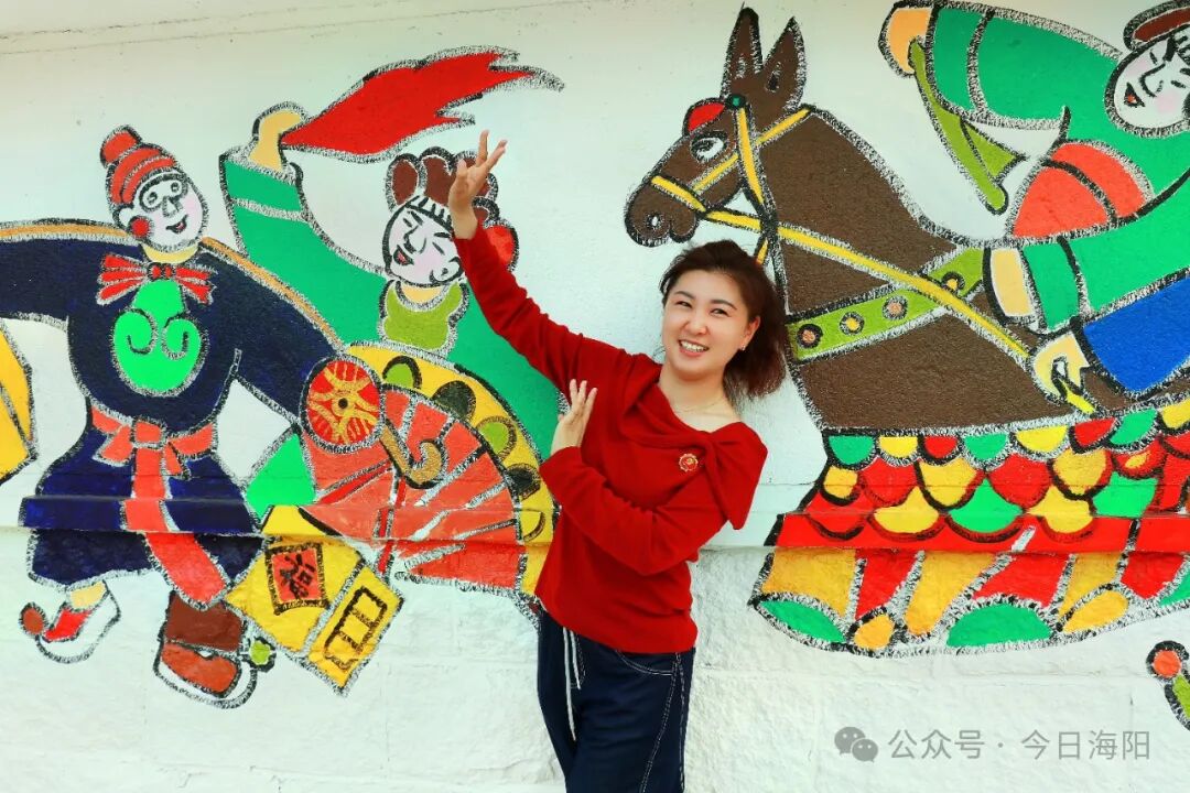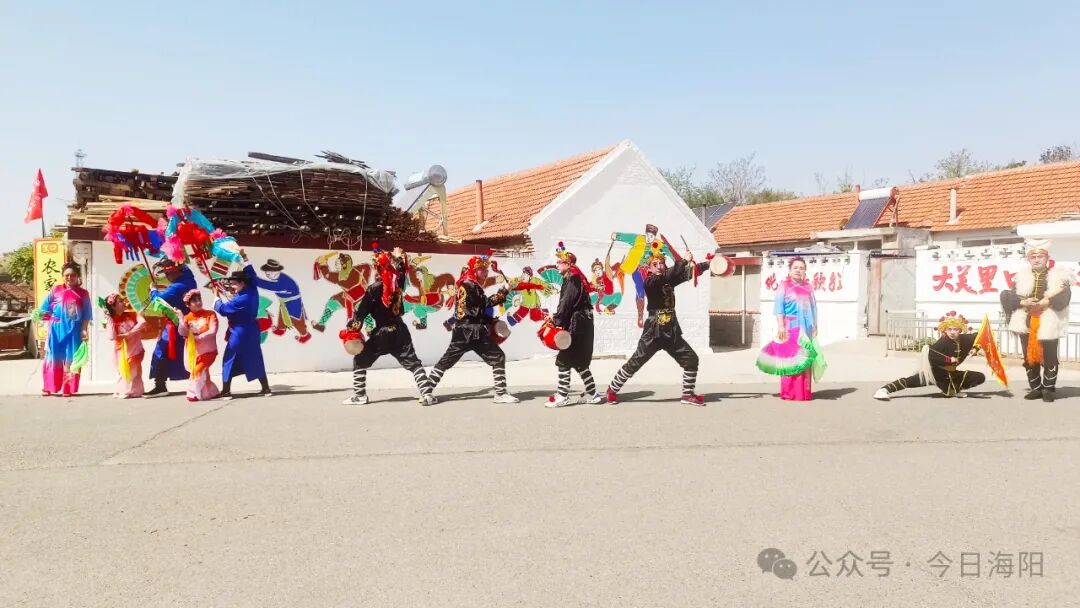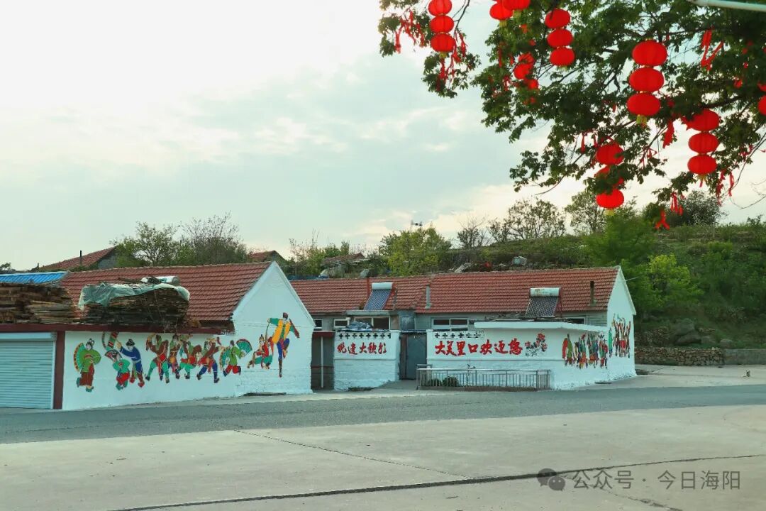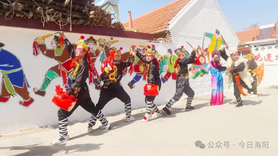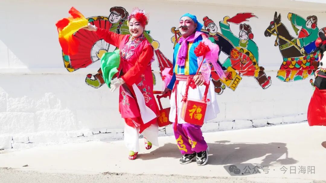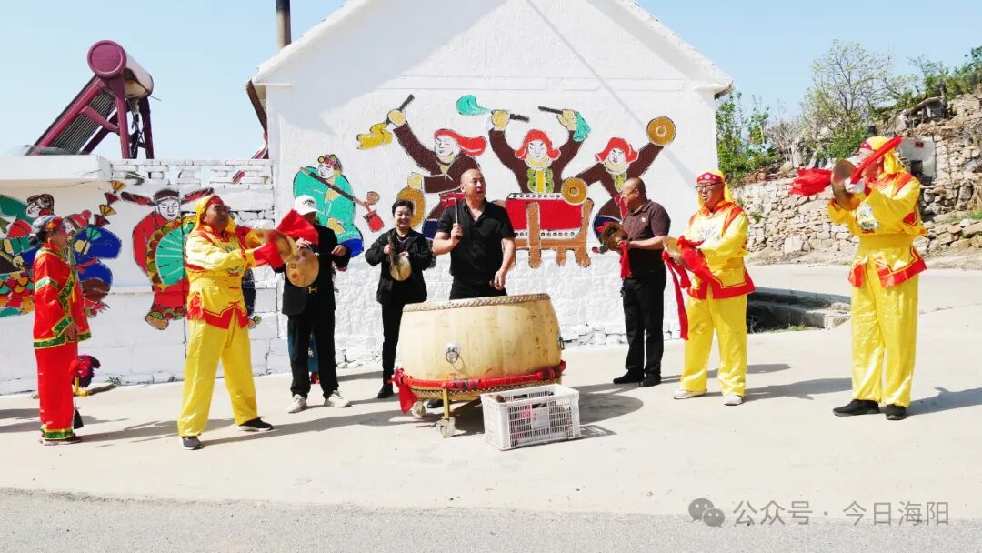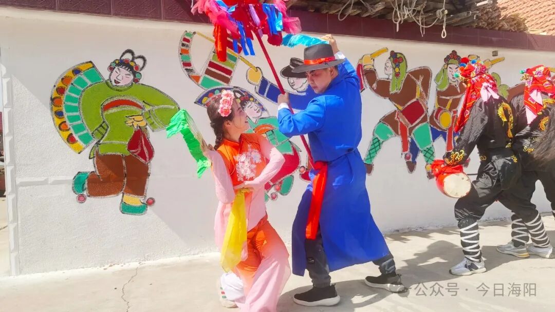 里口村秧歌队队长程肇峰告诉记者,为办好本次山歌会活动,迎接游客们的到来,里口村精心绘制了一面充满海阳大秧歌文化元素的非遗墙,让游客在游玩的同时还能体验非遗文化。该墙绘由西安美院教授杨国福老师与里口村秧歌队成员共同创作完成,整面墙绘色彩鲜艳、细腻逼真,“乐大夫”和花鼓的矫健英姿、货郎与翠花的灵动欢乐、箍漏匠与王大娘的惟妙惟肖,无不诉说着海阳大秧歌悠久而灿烂的文化传承,也让村庄焕发新的生机与活力。