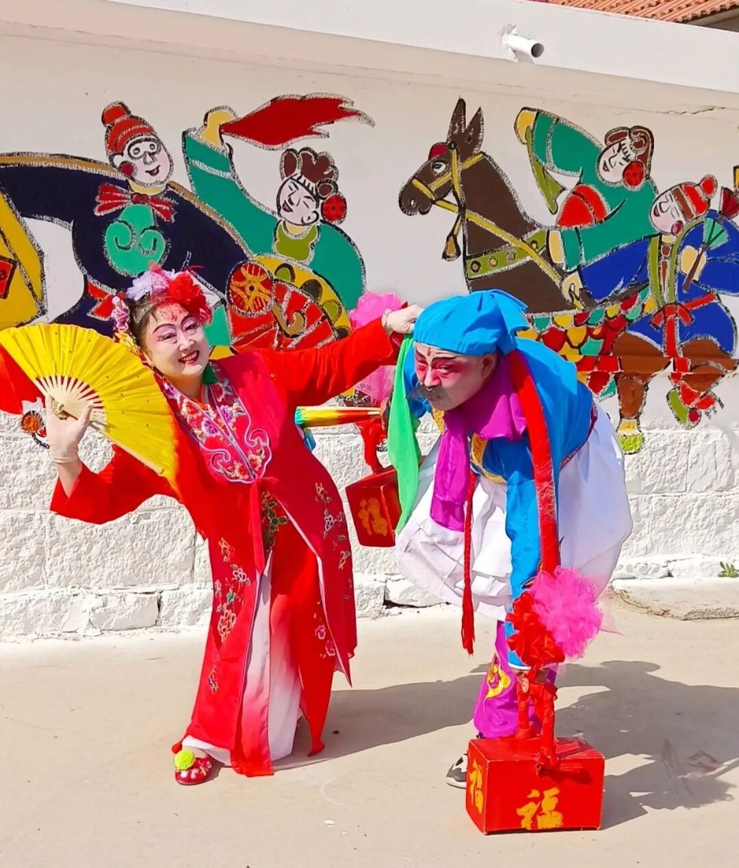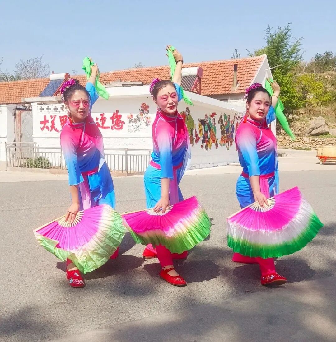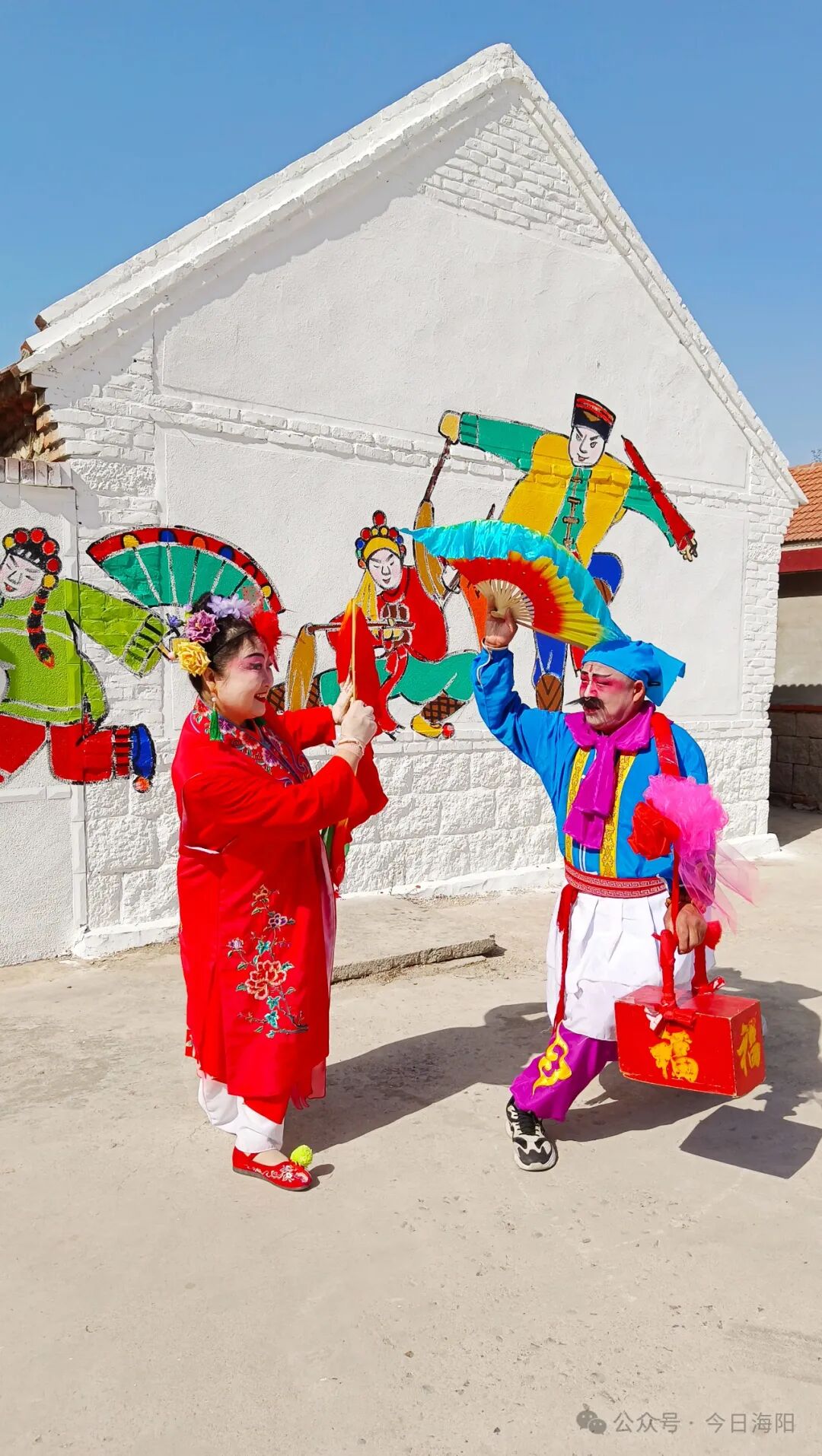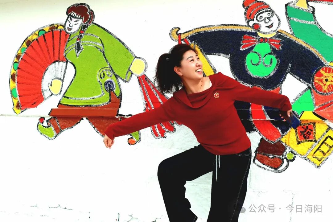 里口村秧歌队队长程肇峰告诉记者,为办好本次山歌会活动,迎接游客们的到来,里口村精心绘制了一面充满海阳大秧歌文化元素的非遗墙,让游客在游玩的同时还能体验非遗文化。该墙绘由西安美院教授杨国福老师与里口村秧歌队成员共同创作完成,整面墙绘色彩鲜艳、细腻逼真,“乐大夫”和花鼓的矫健英姿、货郎与翠花的灵动欢乐、箍漏匠与王大娘的惟妙惟肖,无不诉说着海阳大秧歌悠久而灿烂的文化传承,也让村庄焕发新的生机与活力。