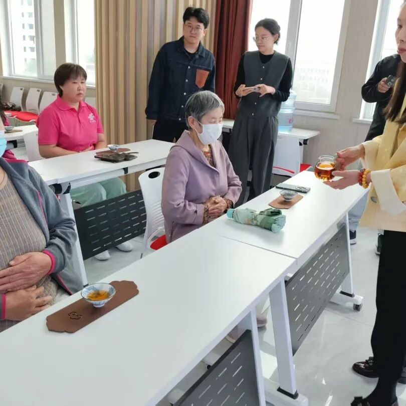理论学习结束后,进入泡茶体验环节。戚老师从容不迫,行云流水般完成温杯、投茶、注水等一系列动作,馥郁茶香瞬间弥漫开来,随后,戚老师将泡好的茶分给居民,大家轻嗅慢抿,现场惊叹与赞美之声此起彼伏。跟随着戚老师的课堂又向大家传授了七碗茶的相关知识,让大家在每一碗茶中感悟人生,体验岁月静好带给身体的能量。