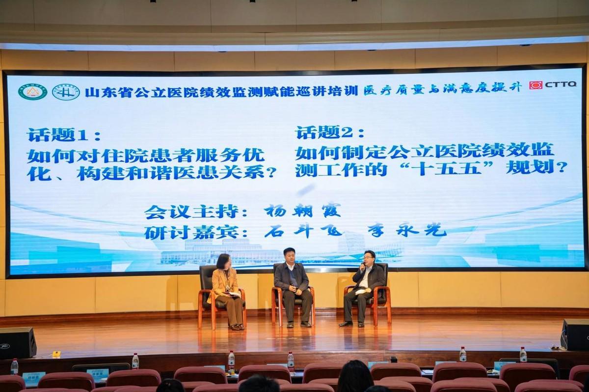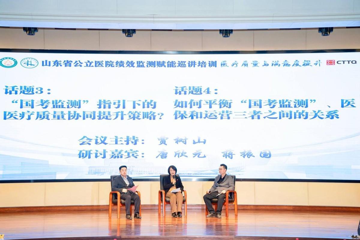 专题讨论环节,滨州医学院附属医院党委委员、医务处处长石斗飞,潍坊市人民医院质量管理办公室主任李永光,山东第一医科大学第二附属医院质量管理办公室主任唐欣元,菏泽市立医院运营管理部主任蒋振国聚焦“国考”政策导向,围绕“医疗质量、运营效率、持续发展、满意度评价”四大维度,结合各自医院实践经验展开了深入交流。专题讨论环节由山东第一医科大学第二附属医院党委副书记杨朝霞、滨州医学院烟台附属医院副院长贾树山先后主持。