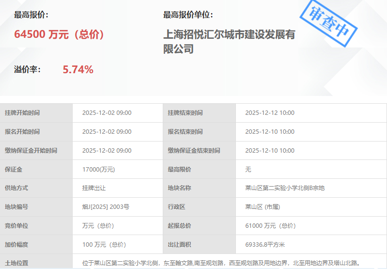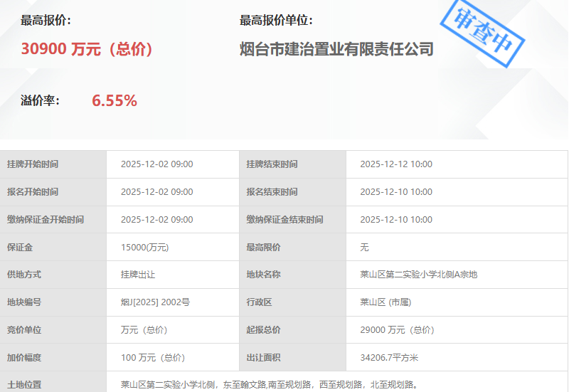 胶东在线12月12日讯(记者 秦秀鹏)今天上午10时,烟台市莱山区第二实验小学北侧两宗优质地块(烟J[2025] 2002号莱山区第二实验小学北侧A宗地、烟J[2025] 2003号莱山区第二实验小学北侧B宗地)正式挂牌成交,总成交金额达9.54亿元,分别由烟台市建治置业有限责任公司、上海招悦汇尔城市建设发展有限公司出价最高3.09亿、6.45亿竞得。本次出让地块地处城市核心发展片区,紧邻优质教育资源,是烟台市推进城市更新、优化民生配套的重点项目,标志着莱山区居住品质与社区服务将迎来新一轮升级。