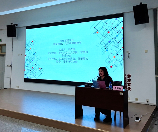 在近两小时的讲座中,王秀梅主席以深厚的理论积淀与丰富的创作经验,从多个维度对“文学中的地理学”展开系统阐释。她融中外文学经典与个人创作实践于一体,生动解读了作家如何将地理空间转化为承载情感温度与文化记忆的文学场域;并特别寄语胶东作家立足本土、放眼广阔世界,在地域特色的深耕与人类普遍关怀的书写之间寻得创作的精准平衡点。