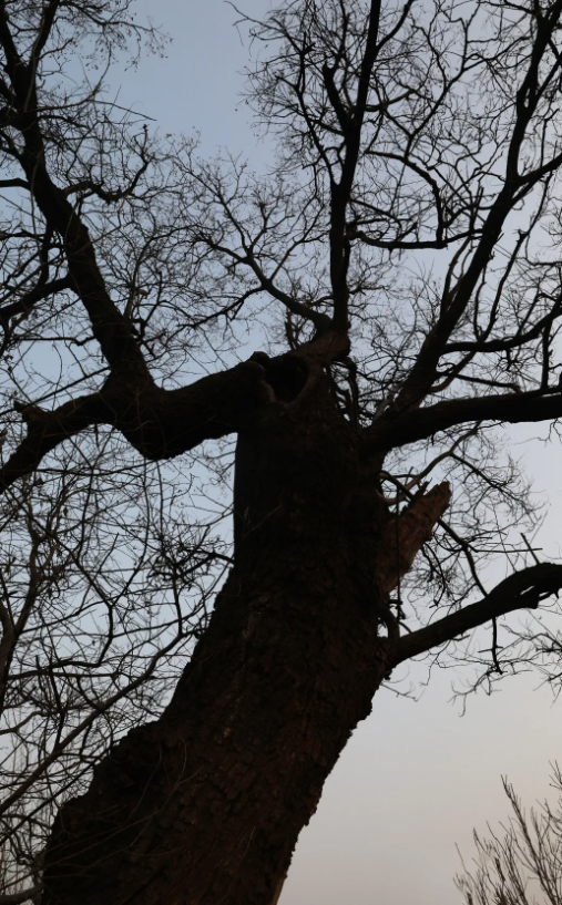 “这树可是俺们村的宝贝!”王国宾在前头引路,语气里透着自豪。站在树下抬头看,树干沧桑虬结,要好几个人伸手才能围拢。有趣的是,明明主干已显枯瘦,旁边却蹿出一簇簇新枝,迎着光朝远处伸去——背后是拆迁留下的空旷土地,这一枯一荣之间,生命的倔强扑面而来。