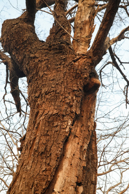 它树干盘旋如苍龙,表皮皲裂,大部分已然干枯,然而,就在这苍劲躯干的背阴处,却长出了新枝,生机勃勃地指向不远处——那里,是被称为“全国重点文物保护单位”的小双桥商代遗址。