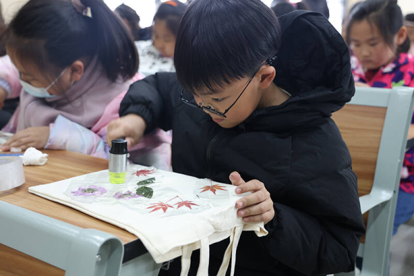 手工实践课上,拓染红枫热闹非凡。8 岁的臧浩翔、10岁的姜博文和崔语萱手持小锤,一下下地锤着花朵和红枫叶,将新鲜红枫的色素印在文创手提袋上。“手有点酸,但特别好玩!” 崔语萱举着作品笑着说,要带回家给父母看。