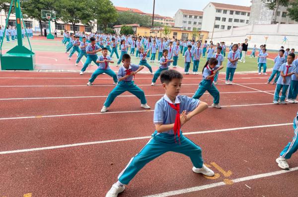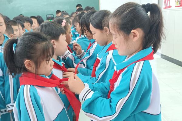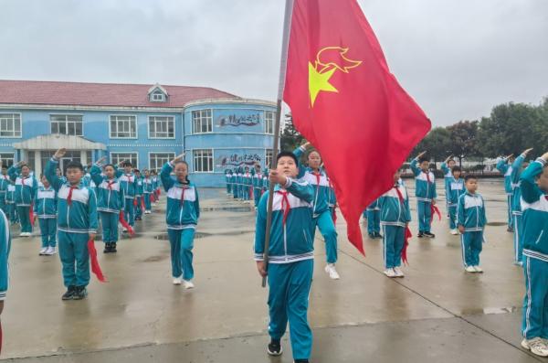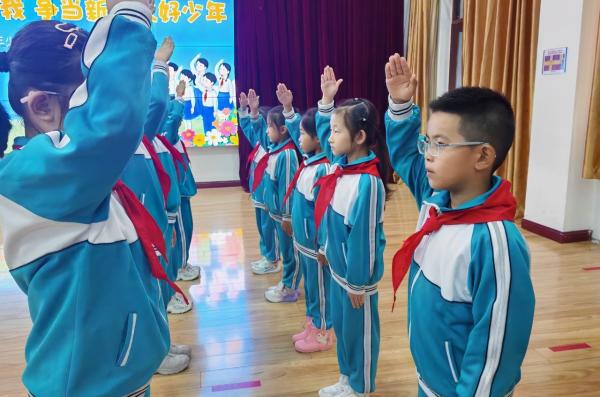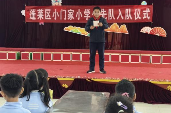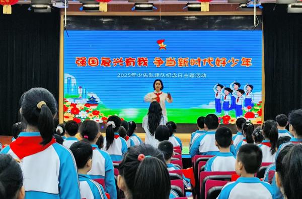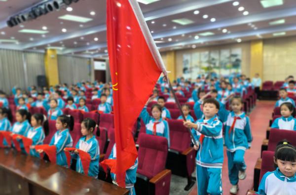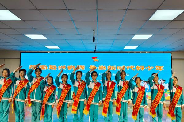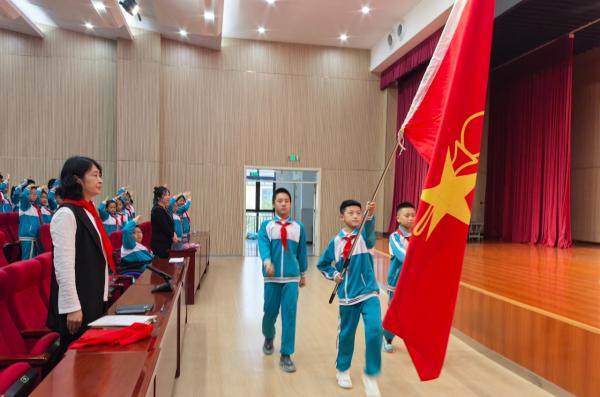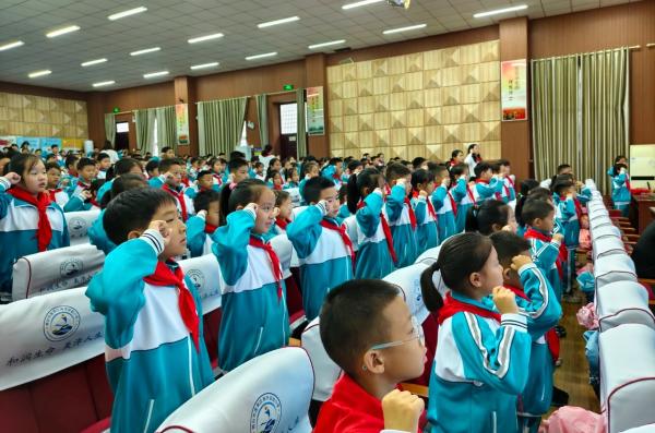 海市实验小学开展 “强国复兴有我 争当新时代好少年” 建队日主题活动。《出旗曲》中,旗手执队旗入场,全体师生肃立行礼,党旗、团旗、队旗依次展扬。大队辅导员宣读新队员名单后,老师与老队员为新队员佩戴红领巾,新队员握拳宣誓。党总支书记赵坤、辅导员老师寄语鼓励队员成 “四有” 新人,新队员代表号召严守队章、立远志。最后大队辅导员带领呼号,退旗曲起仪式落幕。此次蓬莱区海市实验小学 2024 级 555 名学生全员入队,将以担当传承红色基因。