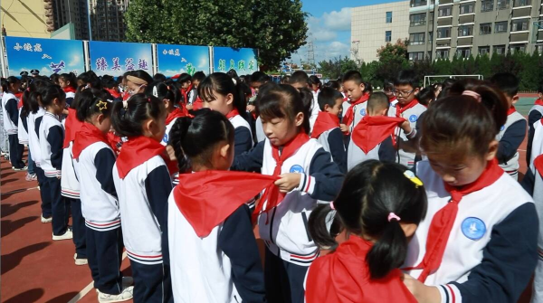 活动在庄严的列队仪式中拉开帷幕。伴随着激昂的《出旗曲》,少先队大队旗入场,全体少先队员肃立敬礼,目光紧紧追随鲜红的大队旗;随后,《中国少年先锋队队歌》响彻校园,队员们用嘹亮的歌声传递对少先队组织的热爱与敬仰。仪式上,大队委宣读了新队员名单。在《红领巾飘起来》的旋律中,各位领导与优秀少先队员代表为新队员佩戴红领巾,鲜艳的红领巾在新队员胸前飘扬,也为他们的童年烙下了“光荣与责任”的印记。