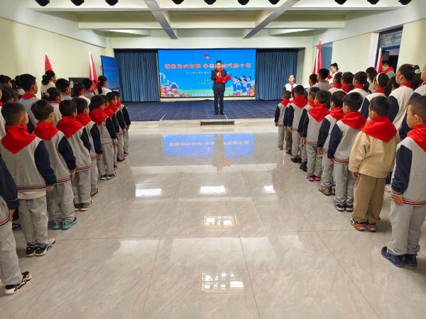 仪式现场,伴随着激昂的出旗曲,大队旗手与护旗手迈着整齐的步伐入场,全体少先队员敬礼致敬。随后,嘹亮的《中国少年先锋队队歌》响彻活动现场。大队辅导员宣读新队员名单后,五年级老队员为新队员佩戴红领巾,鲜艳的红领巾在新队员胸前飘扬,传递着责任与使命。