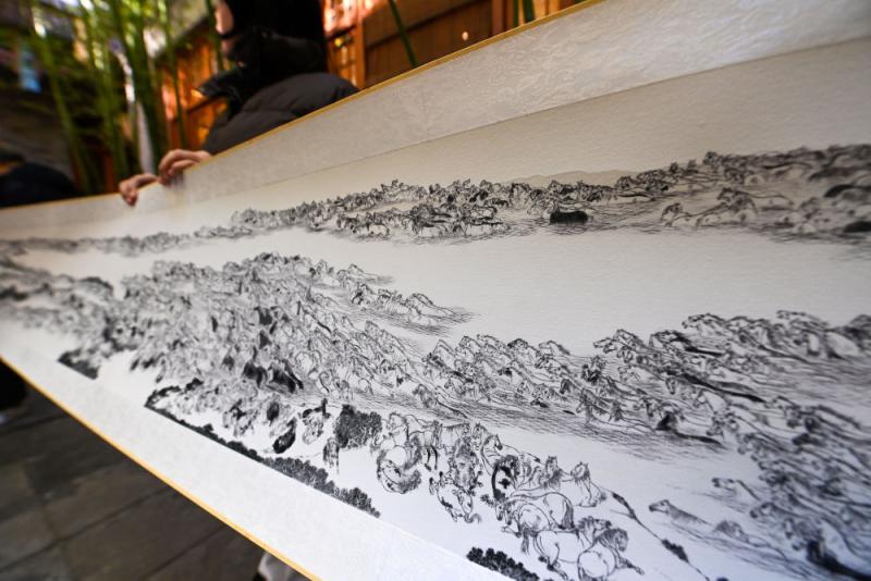 ↑ 这是12月29日在天津古文化街“喜迎马年,五代画马人马画艺术展”上拍摄的画家宫春虎的作品《万马图》(局部)。新华社记者 赵子硕 摄
