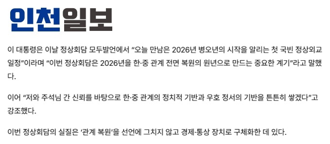 报道援引李在明总统的发言称:“此次会晤将成为推动2026年成为韩中关系全面恢复元年的关键契机。”“双方将持续努力,使两国战略合作伙伴关系发展成不可逆转的时代潮流。”