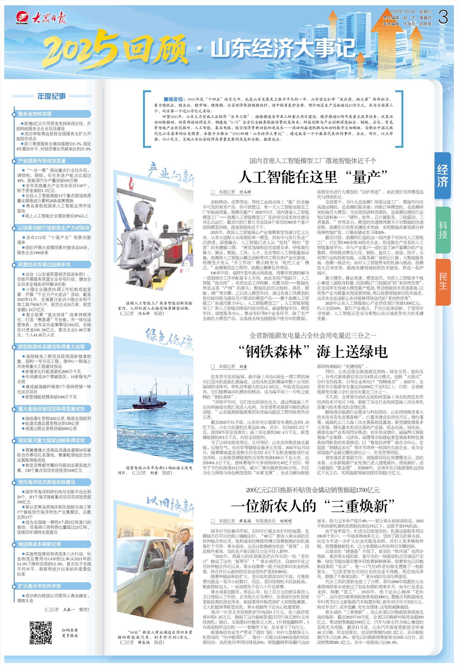 回望2025年,山东大力实施工业经济“头号工程”,接续推进省市县三级重点项目建设,稳步推进92项年度重点改革任务;政策活动双轮驱动,供需两端协同发力,构建起“1+N”全方位全链条提振消费政策体系;科技创新与产业创新深度融合,钢铁、石化、有色等传统产业优化提升,人工智能、集成电路、低空经济等新动能加速成长……涌动的奋进热潮与跃动的数字交相辉映,勾勒出中国式现代化山东篇章的壮美图景。本报今日推出“2025回顾·山东经济大事记”,通过我省一个个最具代表性的事件、企业、项目,以点带面、以小见大,呈现山东社会经济高质量发展的成色和全貌。敬请关注。